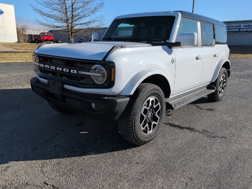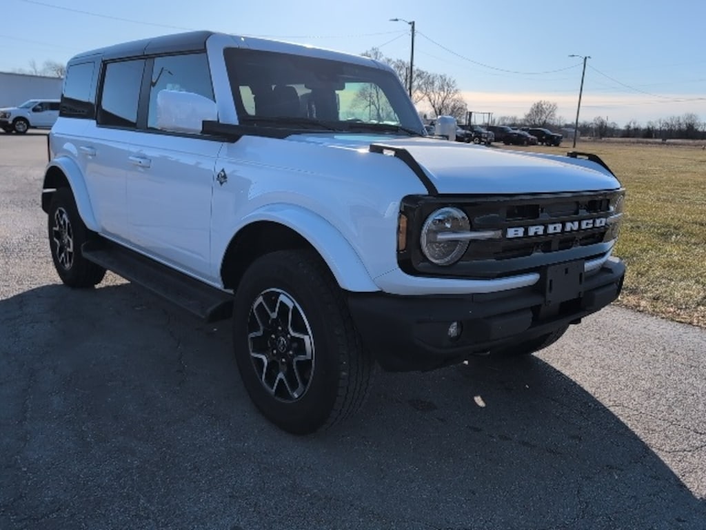 Oxford White 2025 Ford Bronco Outer Banks 4WD 10-Speed Automatic 2.3L EcoBoost I-4 18" Bright Machined Aluminum Wheels, 3.73 Axle Ratio, Air Conditioning, Auto High-beam Headlights, Automatic temperature control, Brake assist, Compass, Connected Navigation, Delay-off headlights, Driver door bin, Driver vanity mirror, Electronic Stability Control, Equipment Group 312A Mid Package, Exterior Parking Camera Rear, Front Bucket Seats, Front Center Armrest, Front dual zone A/C, Front fog lights, Front License Plate Bracket, Front reading lights, Fully automatic headlights, Hard Top Sound Deadening Headliner, Heated door mirrors, Heated front seats, Heated Leather-Trimmed/Vinyl Bucket Seats, Heated steering wheel, Illuminated entry, Internet access capable: FordPass Connect, Leather Shift Knob, Navigation system: Connected Navigation, Outside temperature display, Overhead console, Panic alarm, Passenger door bin, Passenger vanity mirror, Power door mirrors, Power driver seat, Power passenger seat, Power steering, Power windows, Rear seat center armrest, Rear-Window Defroster & Washer, Remote keyless entry, Security system, Shadow Black-Painted Hard Top, Split folding rear seat, Steering wheel mounted audio controls, Tachometer, Telescoping steering wheel, Tilt steering wheel, Trip computer, Voltmeter.