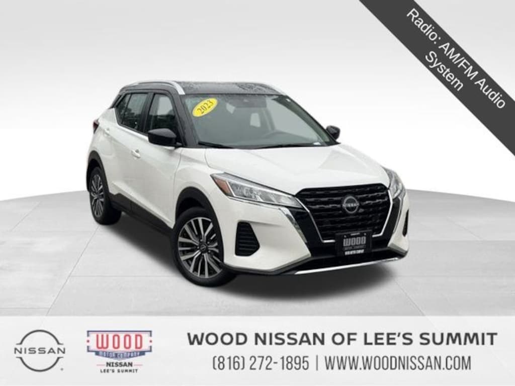 17" Alloy Wheels, Apple CarPlay/Android Auto, Blind Spot Warning, Radio: AM/FM Audio System, Rear Parking Sensors, Remote keyless entry, Steering wheel mounted audio controls. Aspen White Tricoat/Super Black 2023 Nissan Kicks SV FWD CVT with Xtronic 1.6L 4-Cylinder DOHC 16V