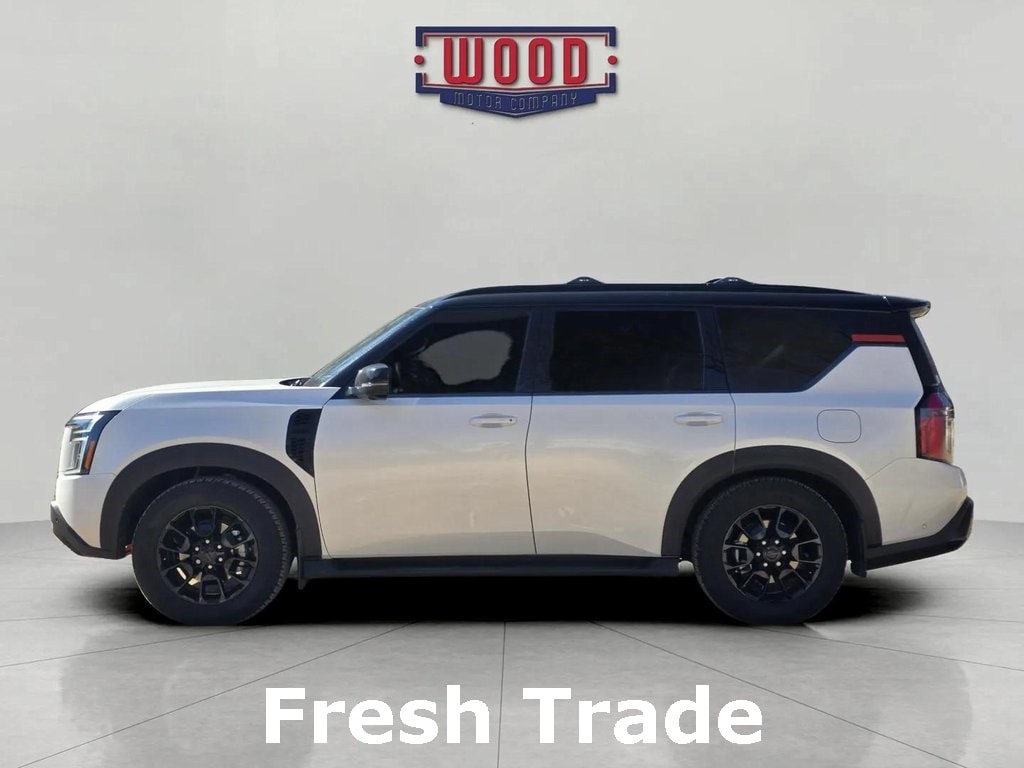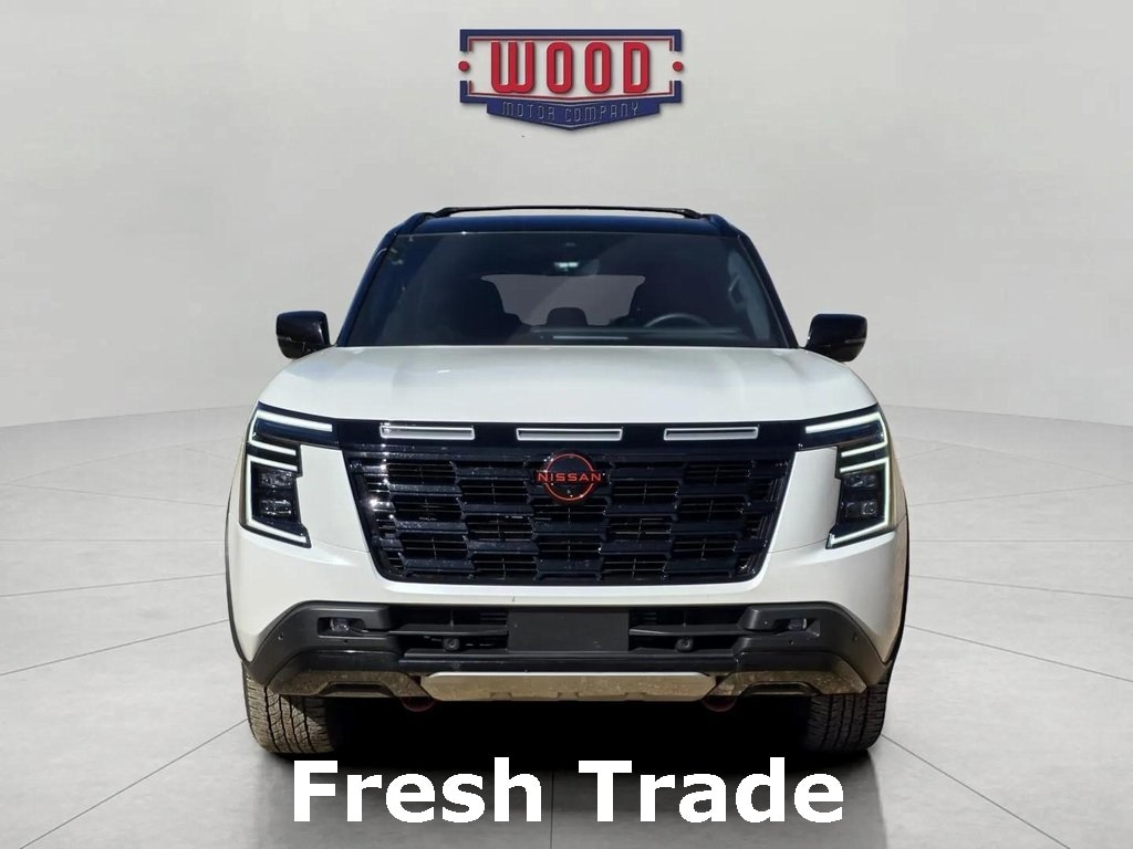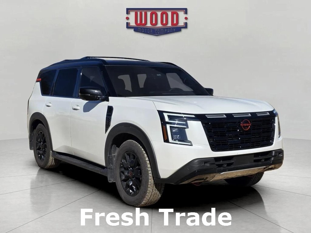 CARFAX One-Owner. Armada PRO-4X, 4D Sport Utility, 3.5L DOHC, 9-Speed Automatic, 4WD, Aspen White Tricoat/Super Black, Charcoal Leather, 3rd row seats: split-bench, Air Conditioning, Automatic temperature control, Electronic Stability Control, Front Bucket Seats, Front dual zone A/C, Fully automatic headlights, Heated Front Bucket Seats, HVAC memory, Memory seat, Navigation System, Power driver seat, Power steering, Power windows, PRO-4X Unique Quilted Leather Seat Trim, Radio: NissanConnect w/SiriusXM 360L, Rear air conditioning, Remote keyless entry, Security system, Steering wheel memory, Steering wheel mounted audio controls, Telescoping steering wheel, Tilt steering wheel. Aspen White Tricoat/Super Black 2025 Nissan Armada PRO-4X 4WD 9-Speed Automatic 3.5L DOHC